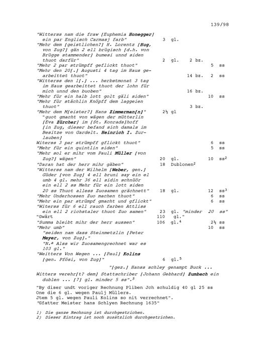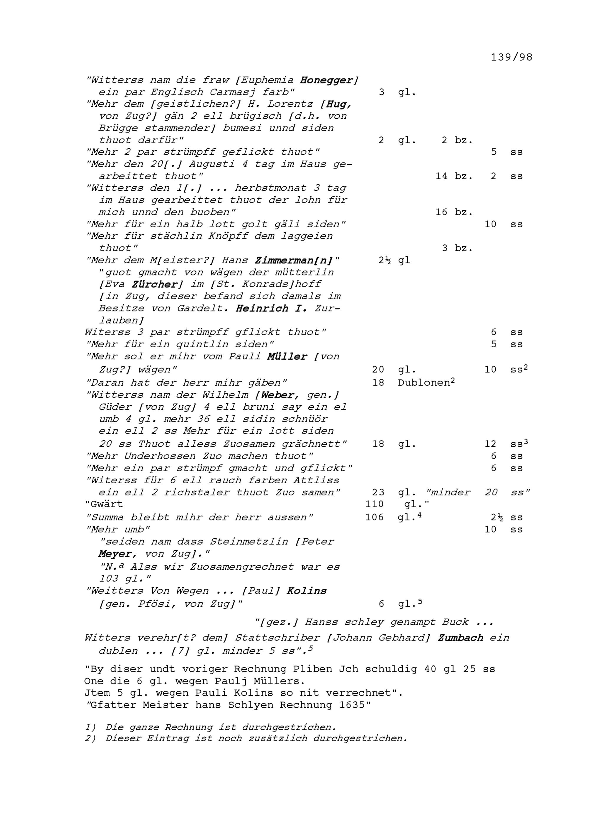 Rechnung für Beat II. Zurlauben, Ammann von Stadt und Amt Zug, ausgestellt von Hans Schley, genannt Buck, Zuger Schneider und Tuchhändler