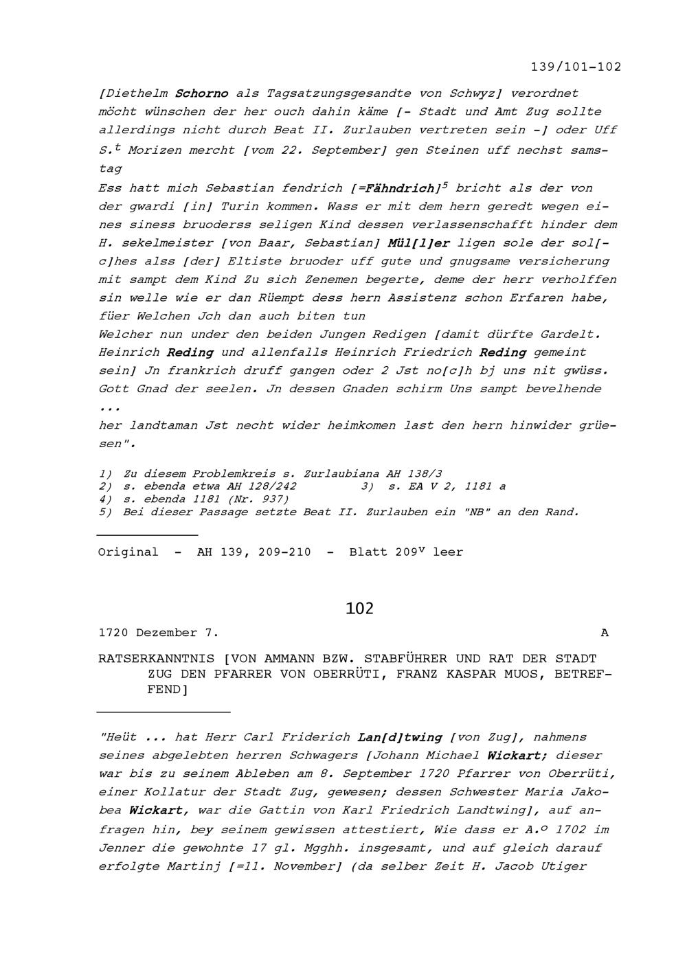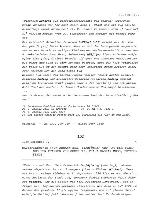 Ratsbeschluss des Ammanns (Stabführers) und Rats der Stadt Zug, betreffend Franz Kaspar Muos, Pfarrer von Oberrüti