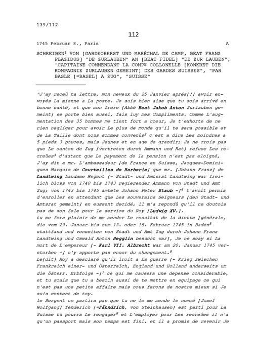 Schreiben von Beat Franz Plazidus Zurlauben, Gardeoberst und Feldmarschall, an Beat...