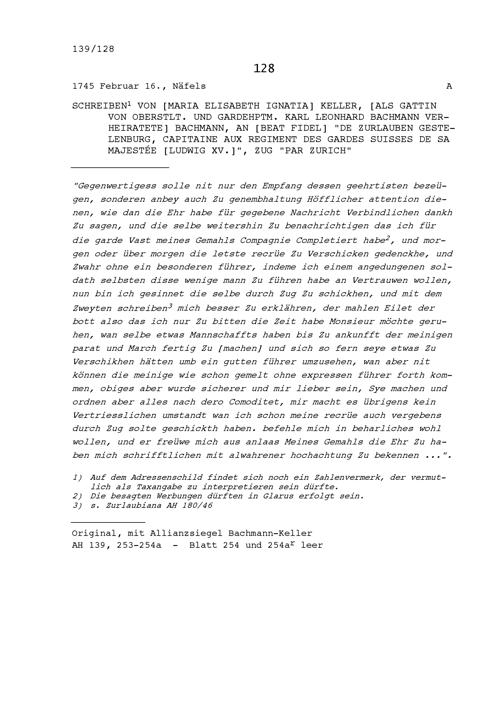 Schreiben von Maria Elisabeth Ignatia Keller, Gattin von Karl Leonhard Bachmann, Oberstleutnant und Gardehauptmann, an Beat Fidel Zurlauben, Hauptmann, Zug