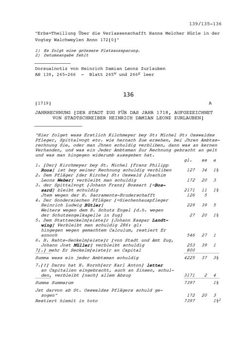 Jahrrechnung der Stadt Zug für das Jahr 1718, aufgezeichnet von Heinrich Damian Leonz Zurlauben, Stadtschreiber