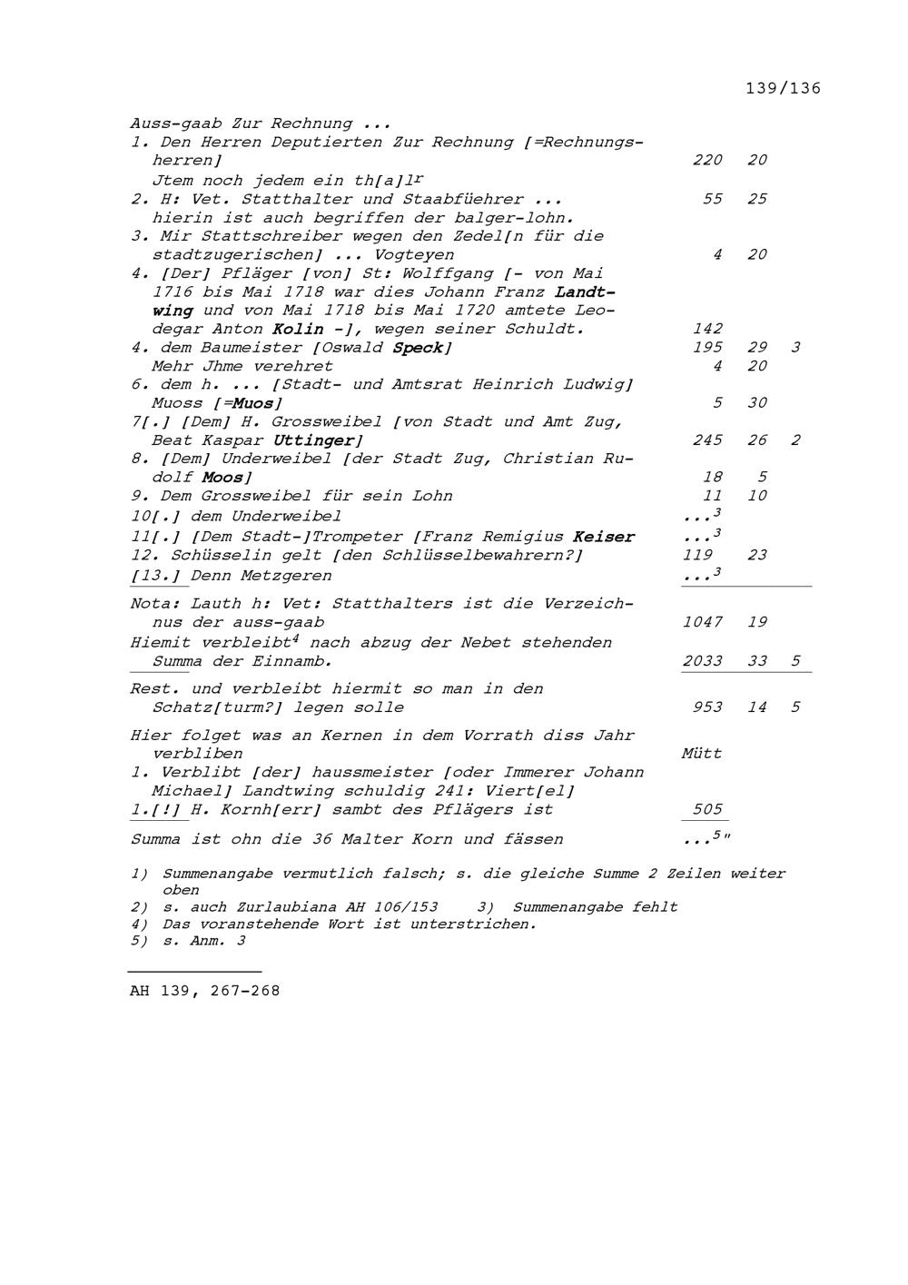 Jahrrechnung der Stadt Zug für das Jahr 1718, aufgezeichnet von Heinrich Damian Leonz Zurlauben, Stadtschreiber