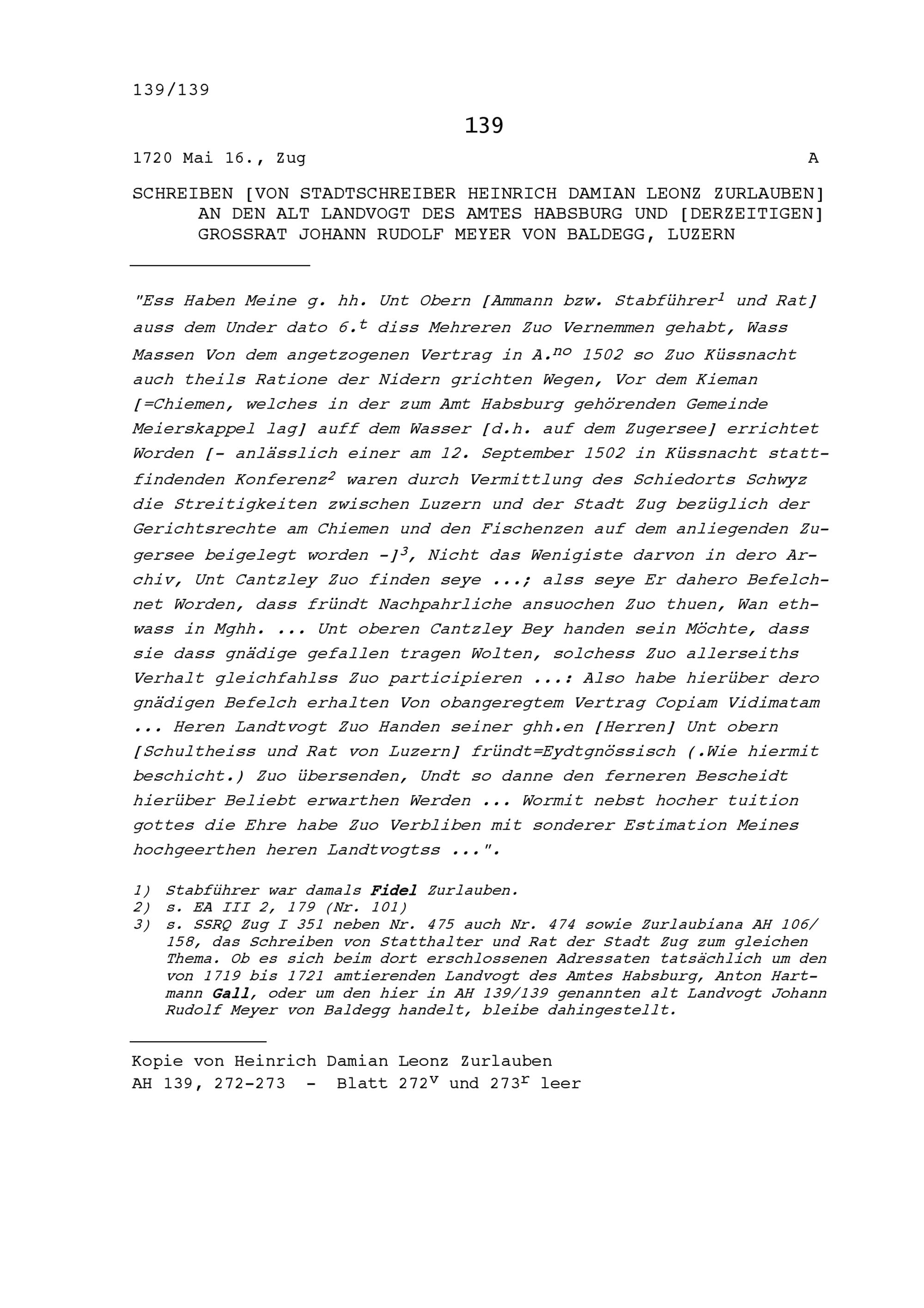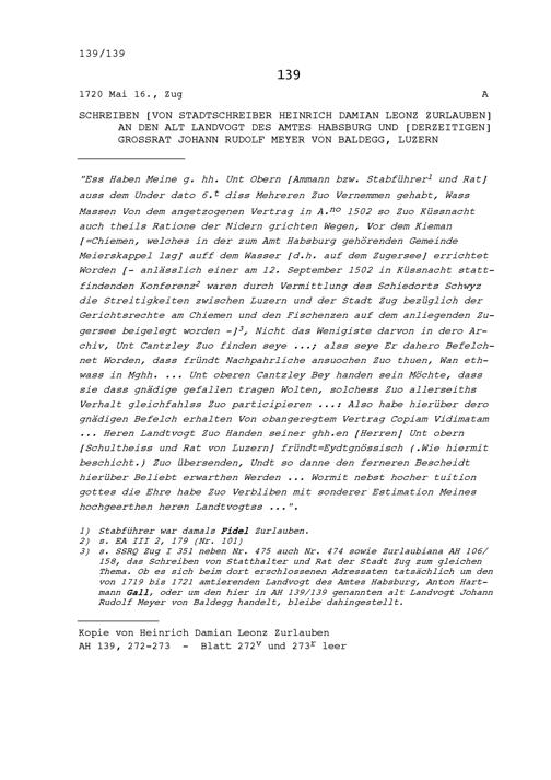Schreiben von Heinrich Damian Leonz Zurlauben, Stadtschreiber, an Johann Rudolf Meyer...