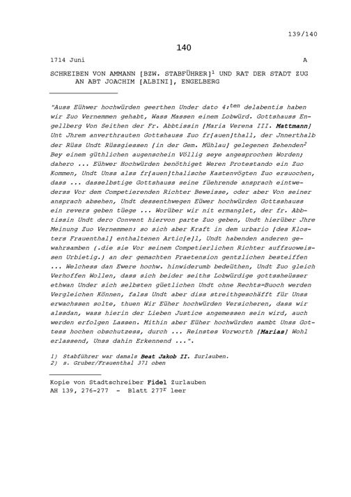 Schreiben des Ammanns (Stabführers) und Rats der Stadt Zug an Joachim Albini, Abt, Engelberg