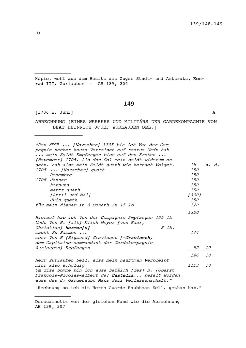Abrechnung eines Werbers und Militärs der Gardekompanie von Beat Heinrich Josef Zurlauben, selig