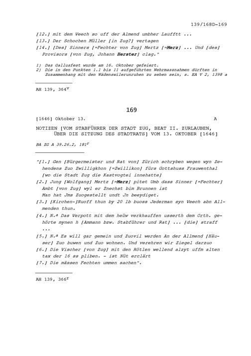 Notiz von Beat II. Zurlauben, Stabführer der Stadt Zug, über die Sitzung des Stadtrats vom 13. Oktober 1646