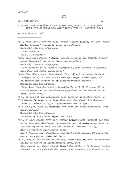 Notiz von Beat II. Zurlauben, Stabführer der Stadt Zug, über die Sitzung des Stadtrats vom 20. Oktober 1646