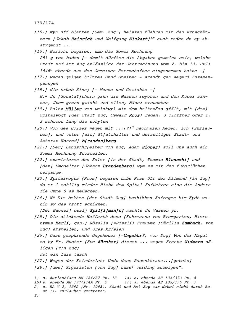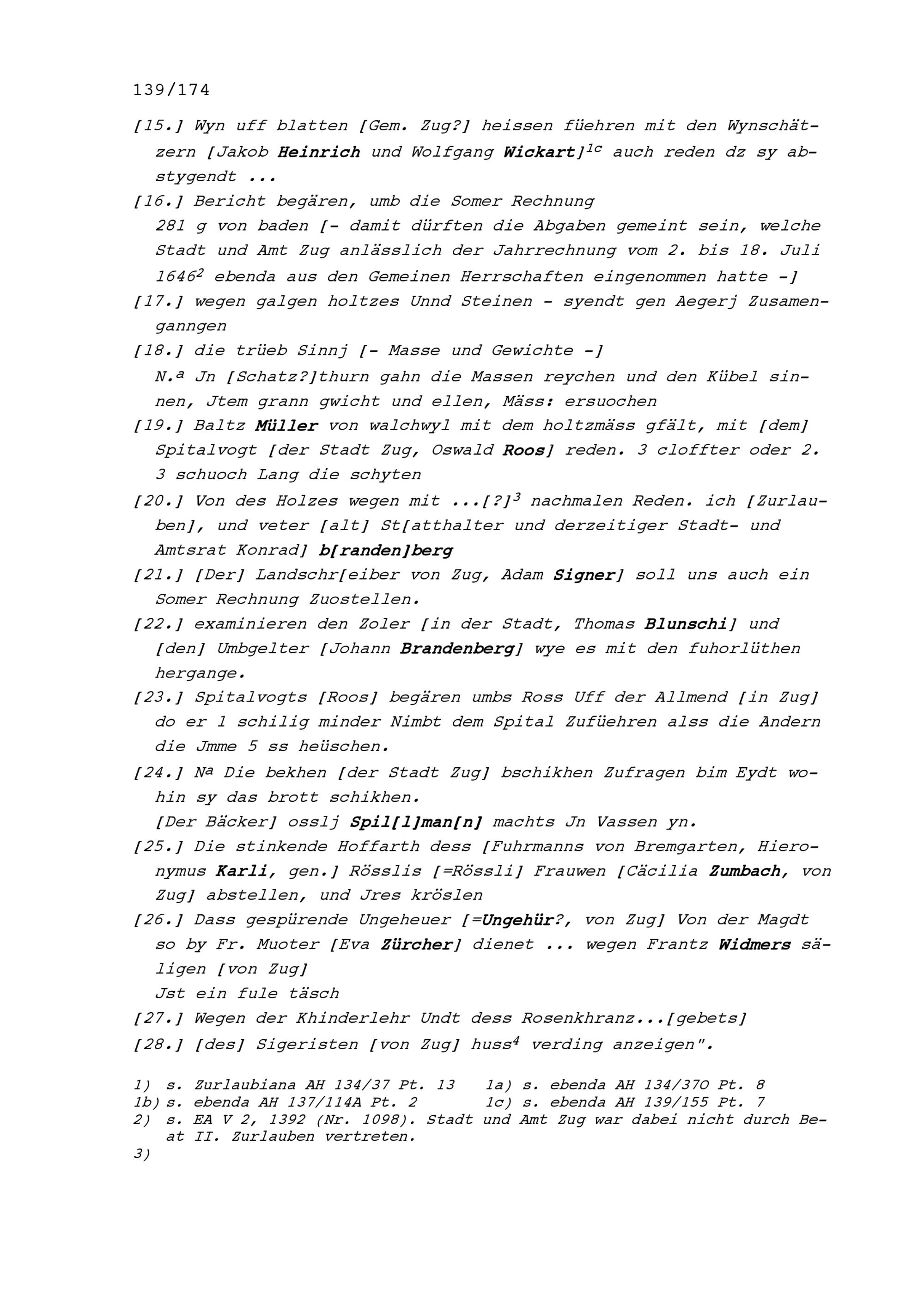 Notiz von Beat II. Zurlauben, Stabführer der Stadt Zug, über die Sitzung des Stadtrats vom 4. August 1646