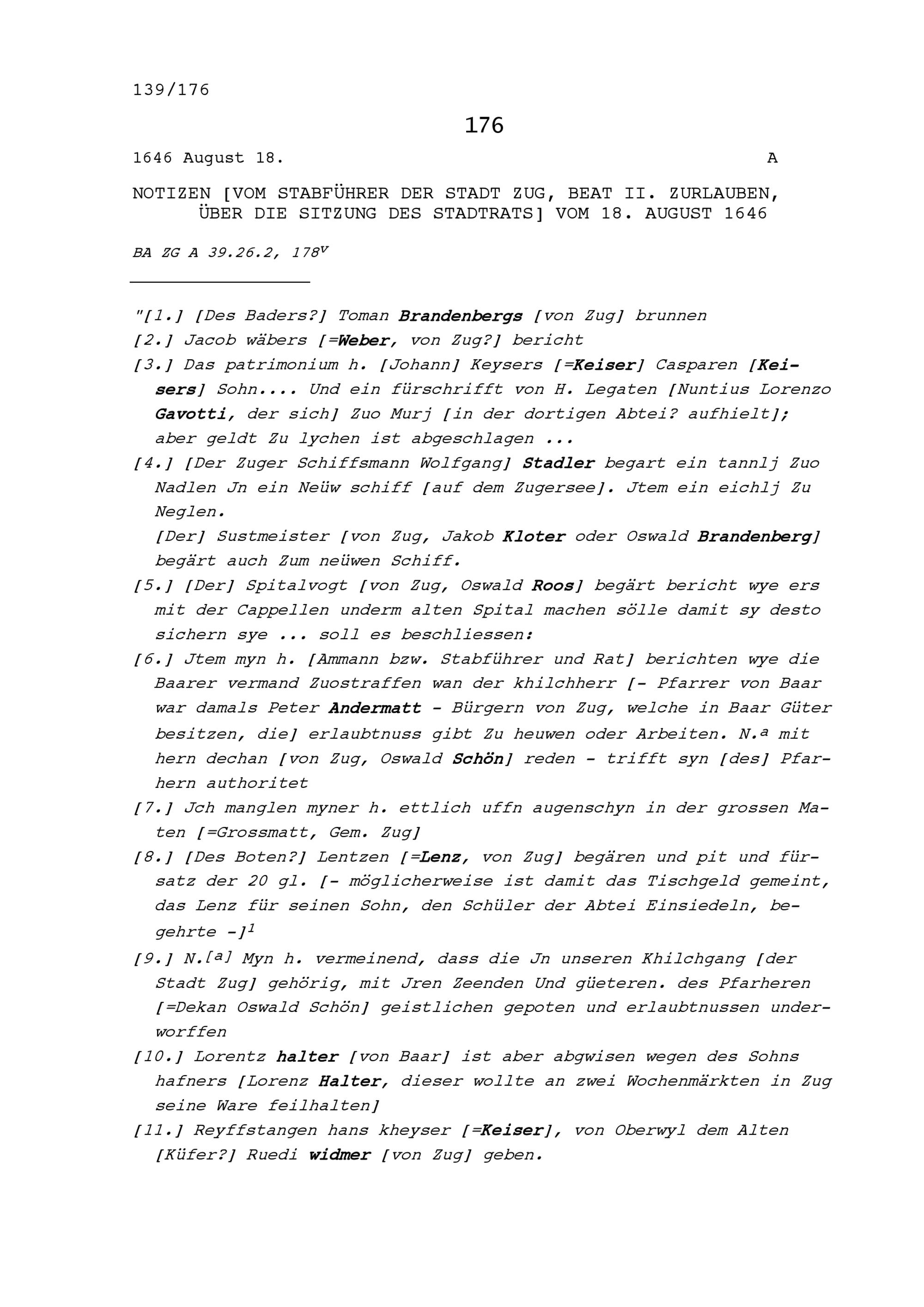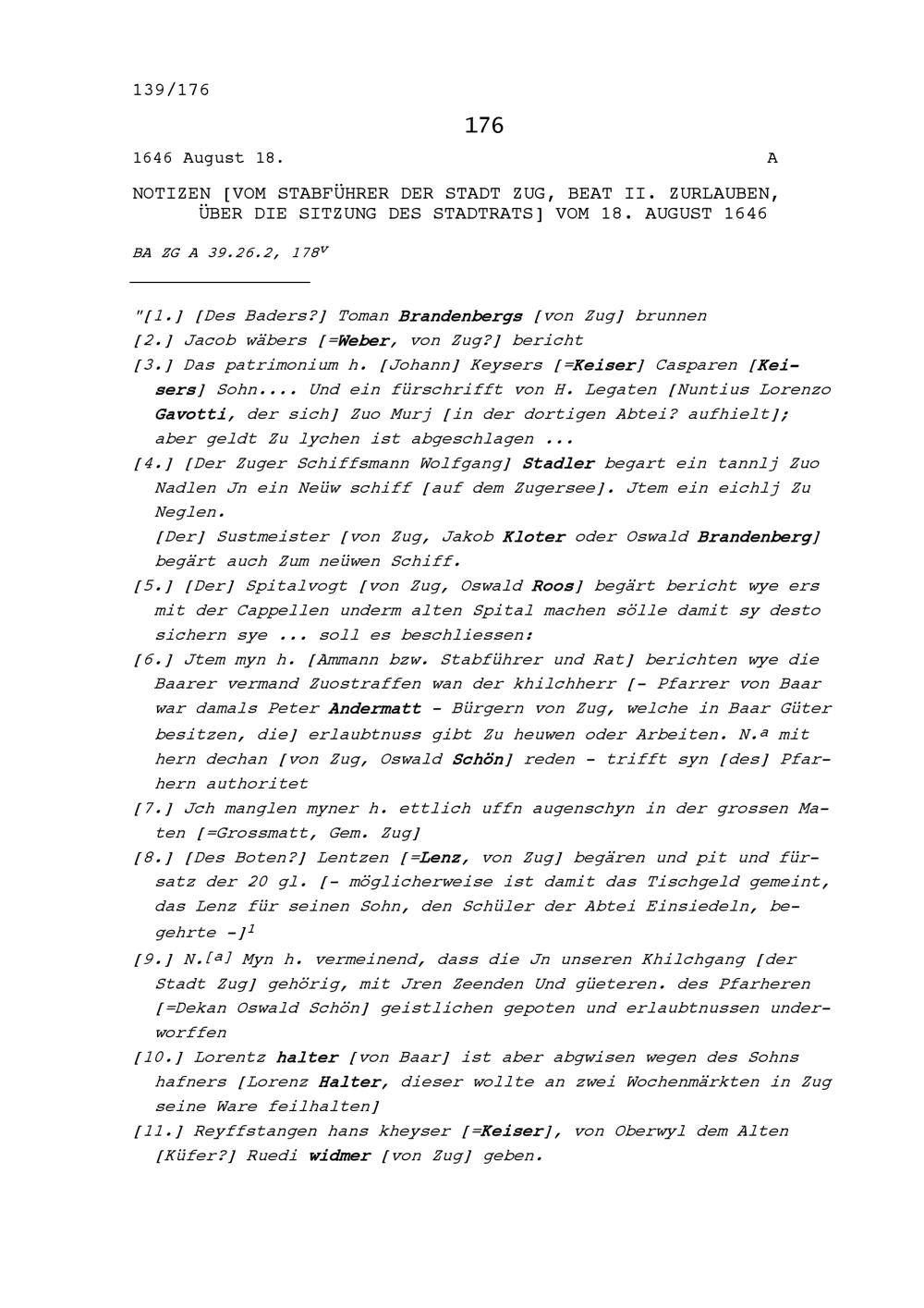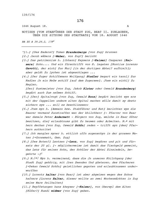 Notiz von Beat II. Zurlauben, Stabführer der Stadt Zug, über die Sitzung des Stadtrats vom 18. August 1646
