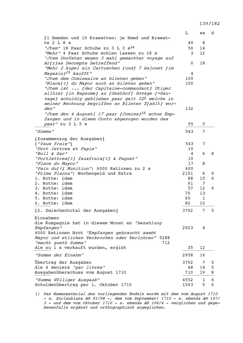 Mannschafts- und Soldrodel der Kompanie von Beat Jakob II. Zurlauben, Hauptmann im Regiment Pfyffer in französischen Diensten, Garnison à Bapaume