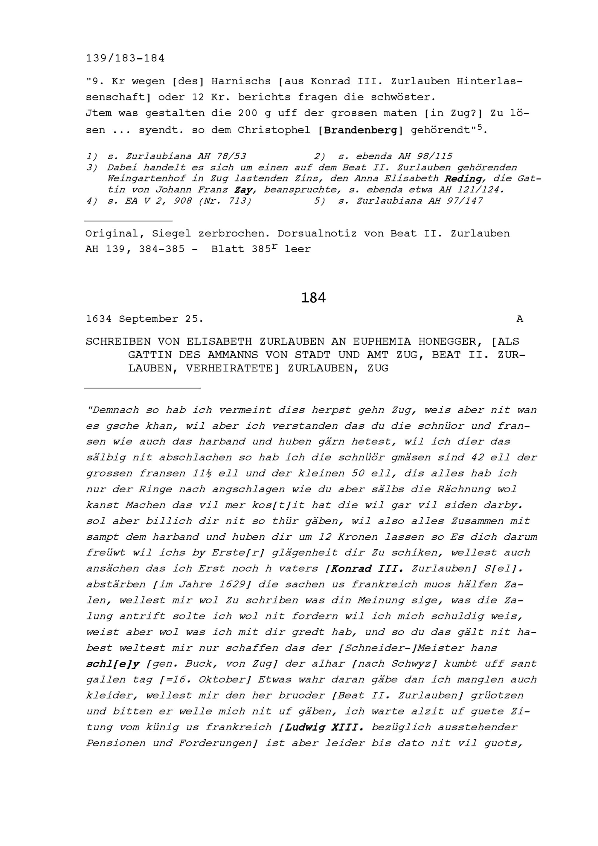 Schreiben von Elisabeth Zurlauben an Euphemia Honegger, Gattin von Beat II. Zurlauben, Ammann von Stadt und Amt Zug, Zug
