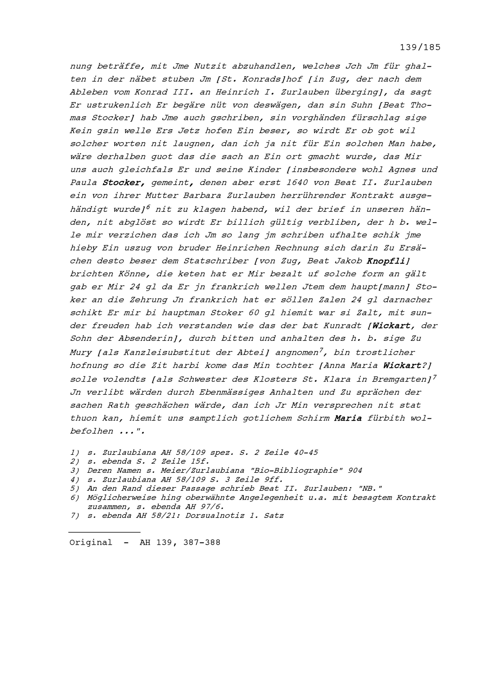 Schreiben von Elisabeth Zurlauben an Beat II. Zurlauben, Ammann und Stadt- und Amtrat, Gardehauptmann, Zug