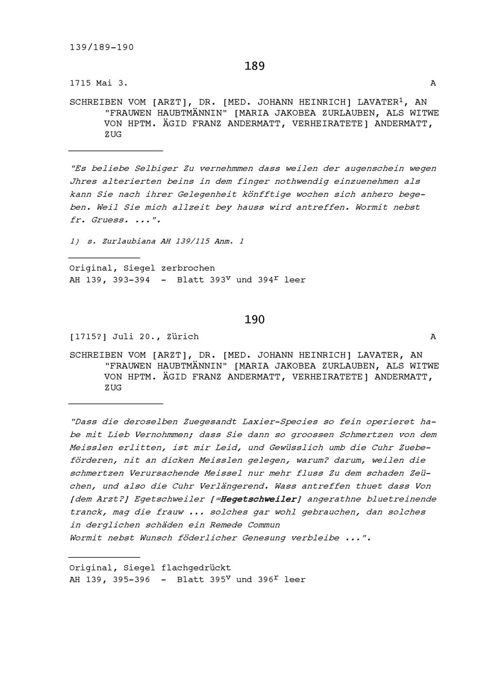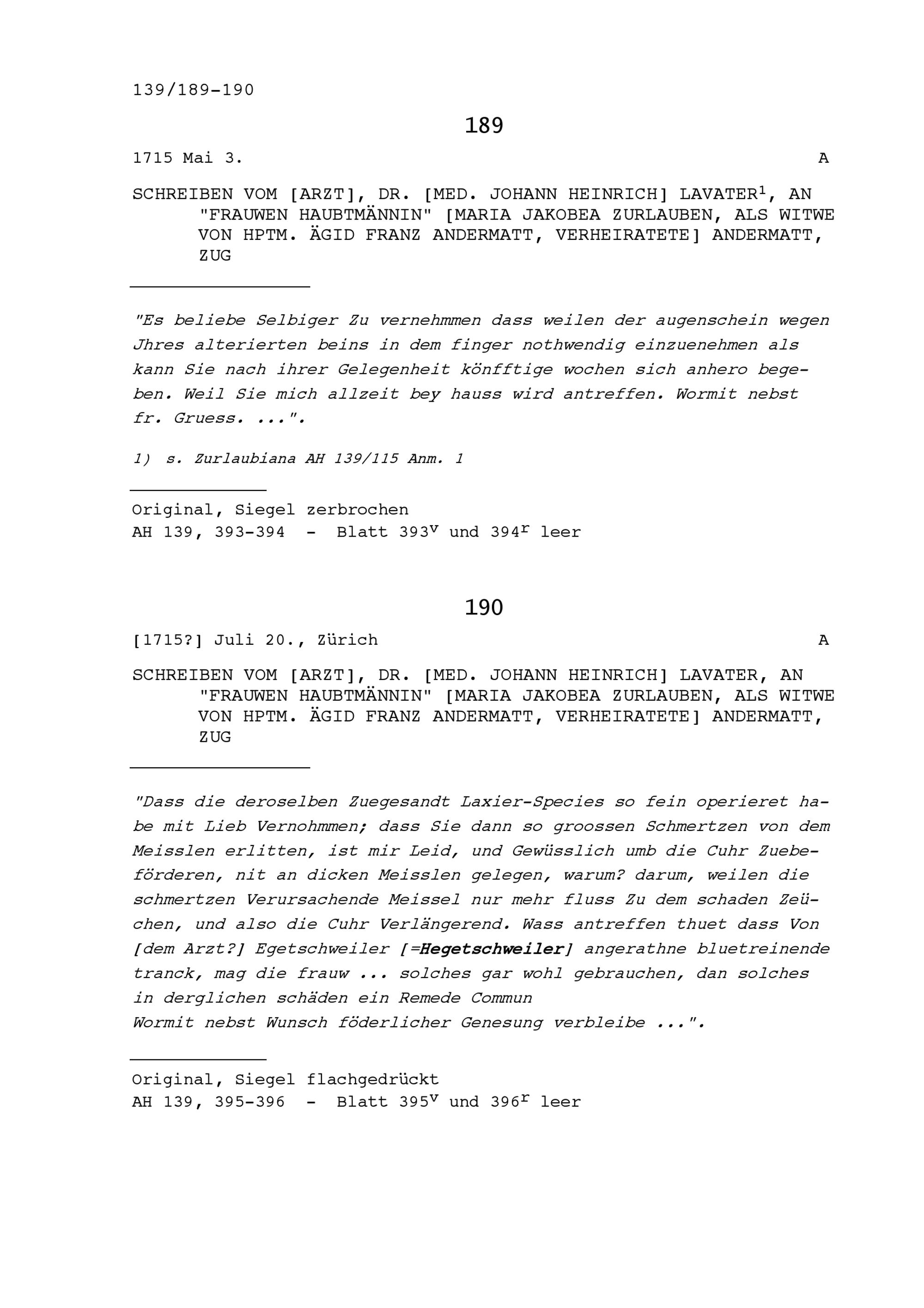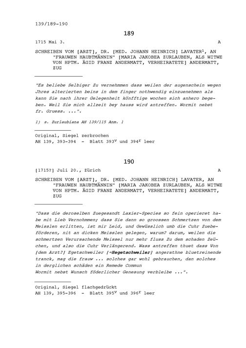 Schreiben von Johann Heinrich Lavater, Dr. med., an Maria Jakobea Zurlauben, Witwe von Ägid Franz Andermatt, Hauptmann, Zug