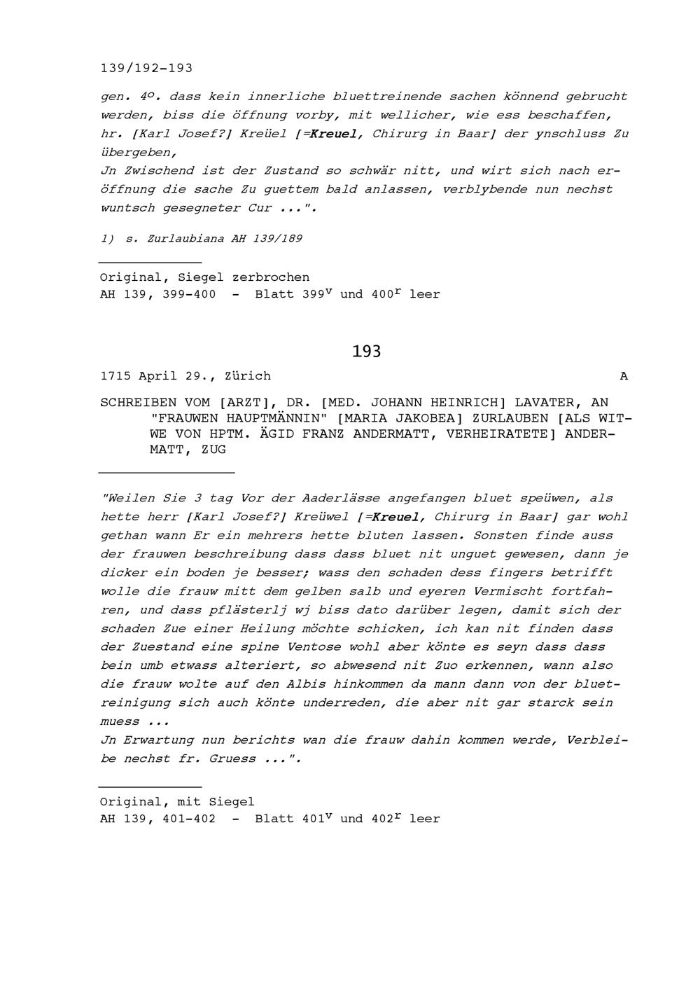 Schreiben von Johann Heinrich Lavater, Dr. med., an Maria Jakobea Zurlauben, Witwe von Ägid Franz Andermatt, Hauptmann, Zug