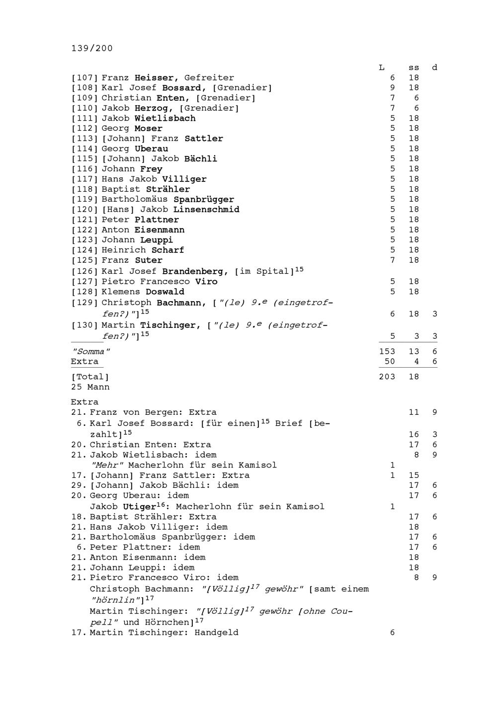 Mannschafts- und Soldrodel der Kompanie von Beat Jakob II. Zurlauben, Hauptmann im Regiment Pfyffer in französischen Diensten