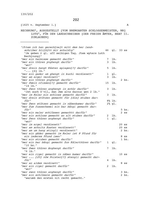 Rechnung für Beat II. Zurlauben, Landschreiber der Freien Ämter, ausgestellt von NN Lutz, Bremgarter Schlossermeister,