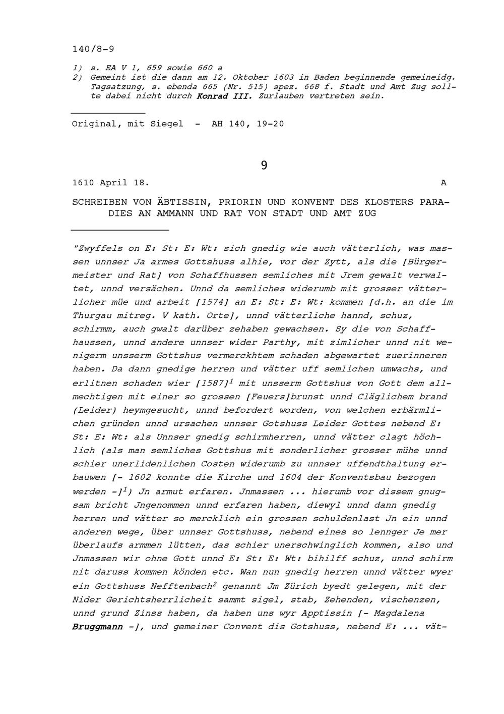 Schreiben der Äbtissin, Priorin und des Konvents des Klosters Paradies an Ammann und Rat von Stadt und Amt Zug