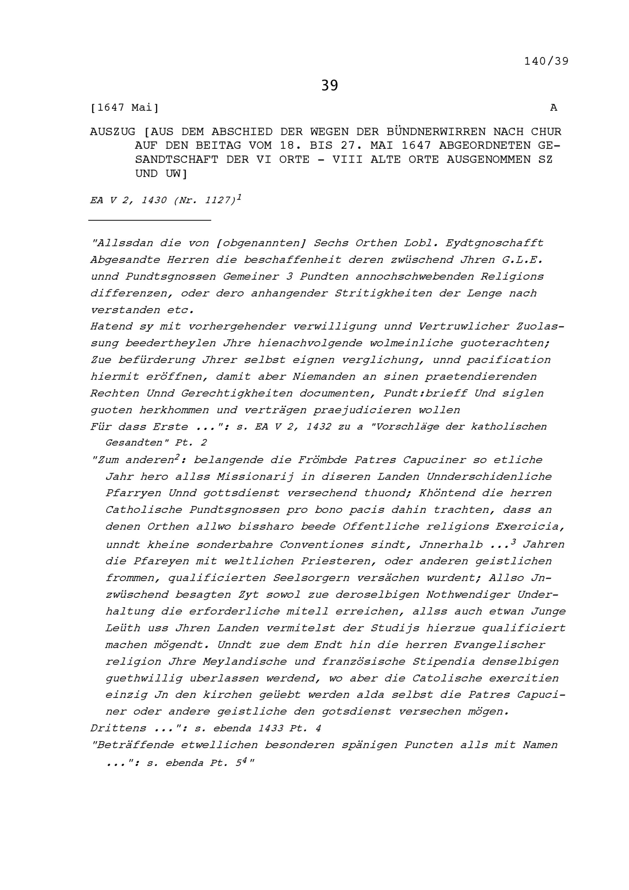 Abschied der wegen der Bündnerwirren nach Chur auf den Beitag vom 18. bis 27. Mai 1647 abgeordneten Gesandtschaft der Sechs Orte