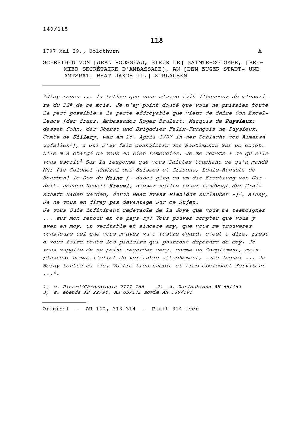 Schreiben von Jean Rousseau, Sieur de Sainte-Colombe, Botschaftssekretär, an Beat Jakob II. Zurlauben, Stadt- und Amtrat Zug