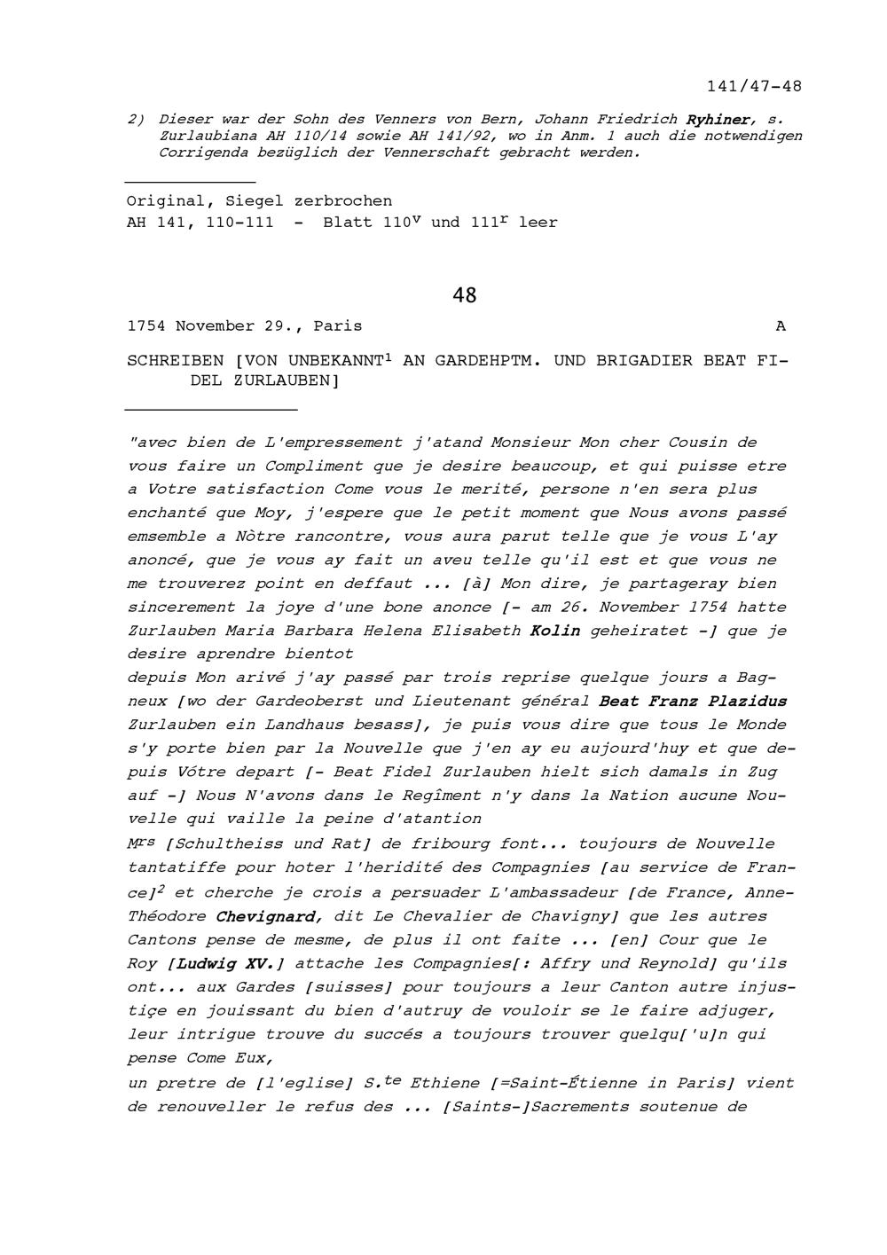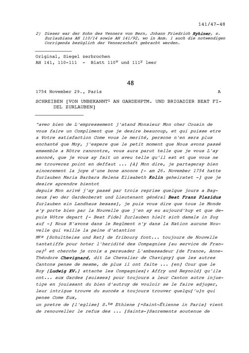 Schreiben von Unbekannt an Beat Fidel Zurlauben, Gardehauptmann und Brigadier