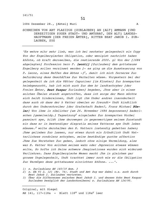 Schreiben von Plazidus Zurlauben, Abt, an Beat Jakob I. Zurlauben, Altammann und Stadt- und Amtrat Zug, Altlandeshauptmann der Freien Ämter, Zug