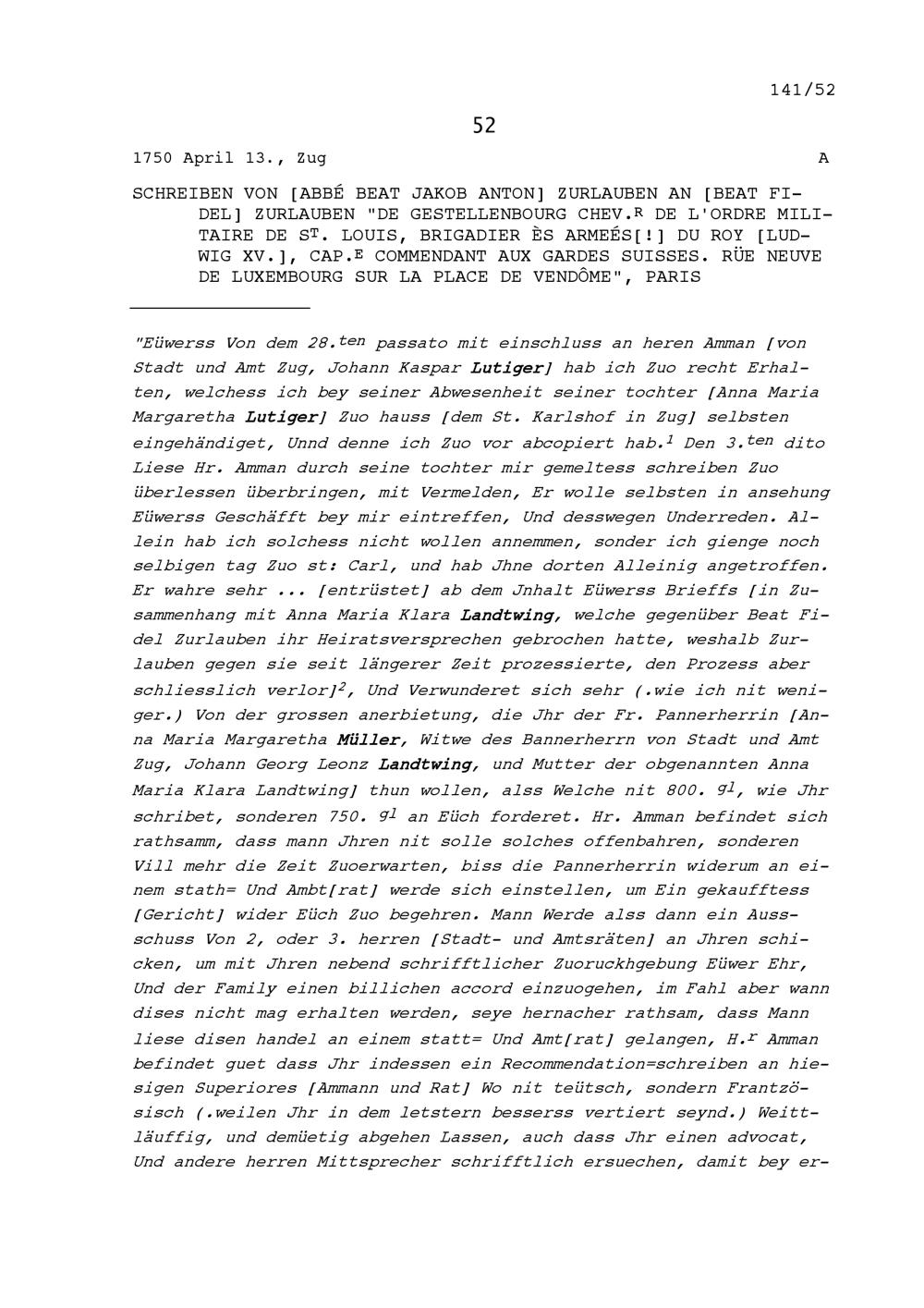 Schreiben von Beat Jakob Anton Zurlauben, Priester, an Beat Fidel Zurlauben, Brigadier und Hauptmann, Paris