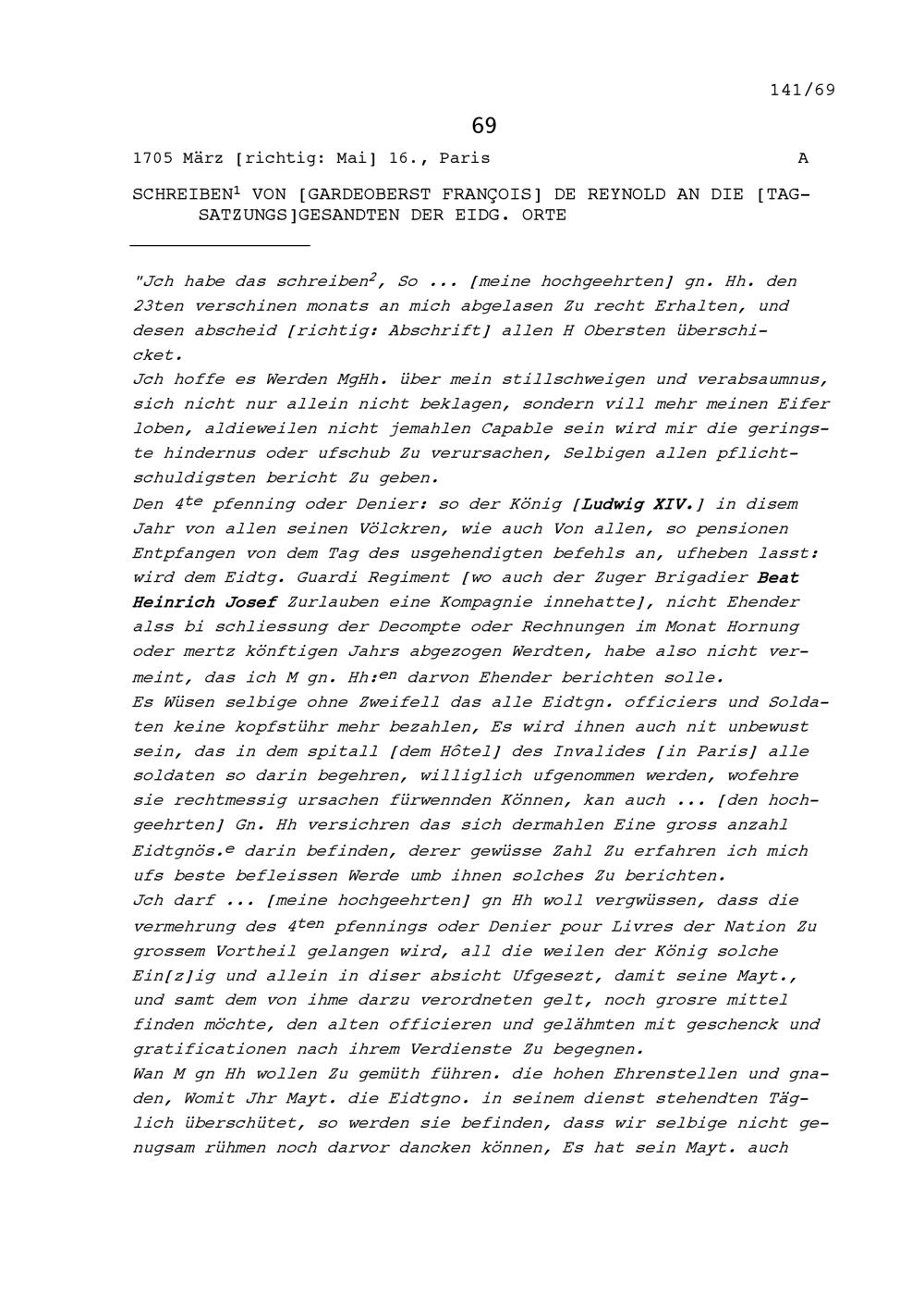 Schreiben von François de Reynold, Gardeoberst, an die Tagsatzungsgesandten der Eidgenössischen...