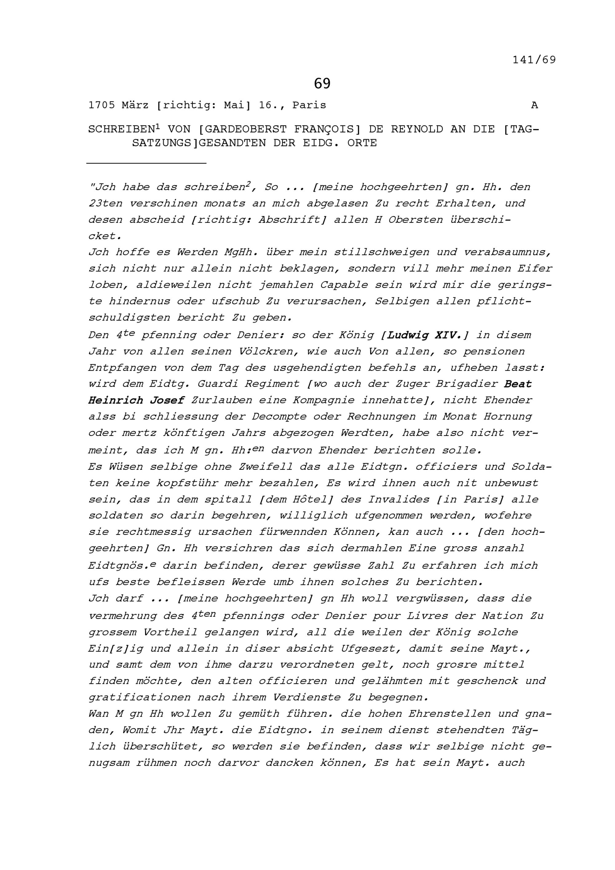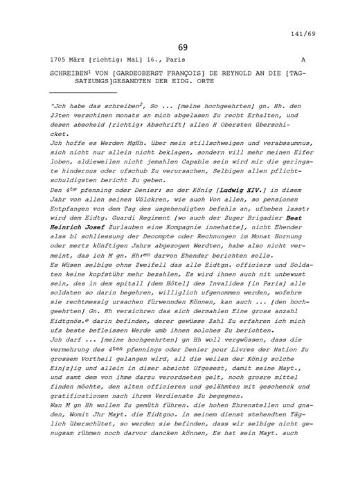 Schreiben von François de Reynold, Gardeoberst, an die Tagsatzungsgesandten der Eidgenössischen Orte