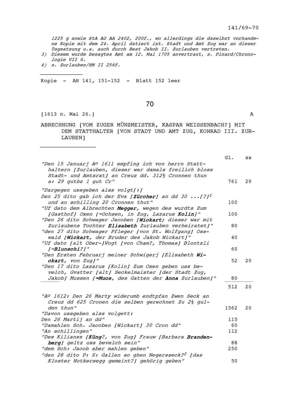 Abrechnung von Kaspar Weissenbach, Zuger Münzmeister, mit Konrad III. Zurlauben, Statthalter von Stadt und Amt Zug