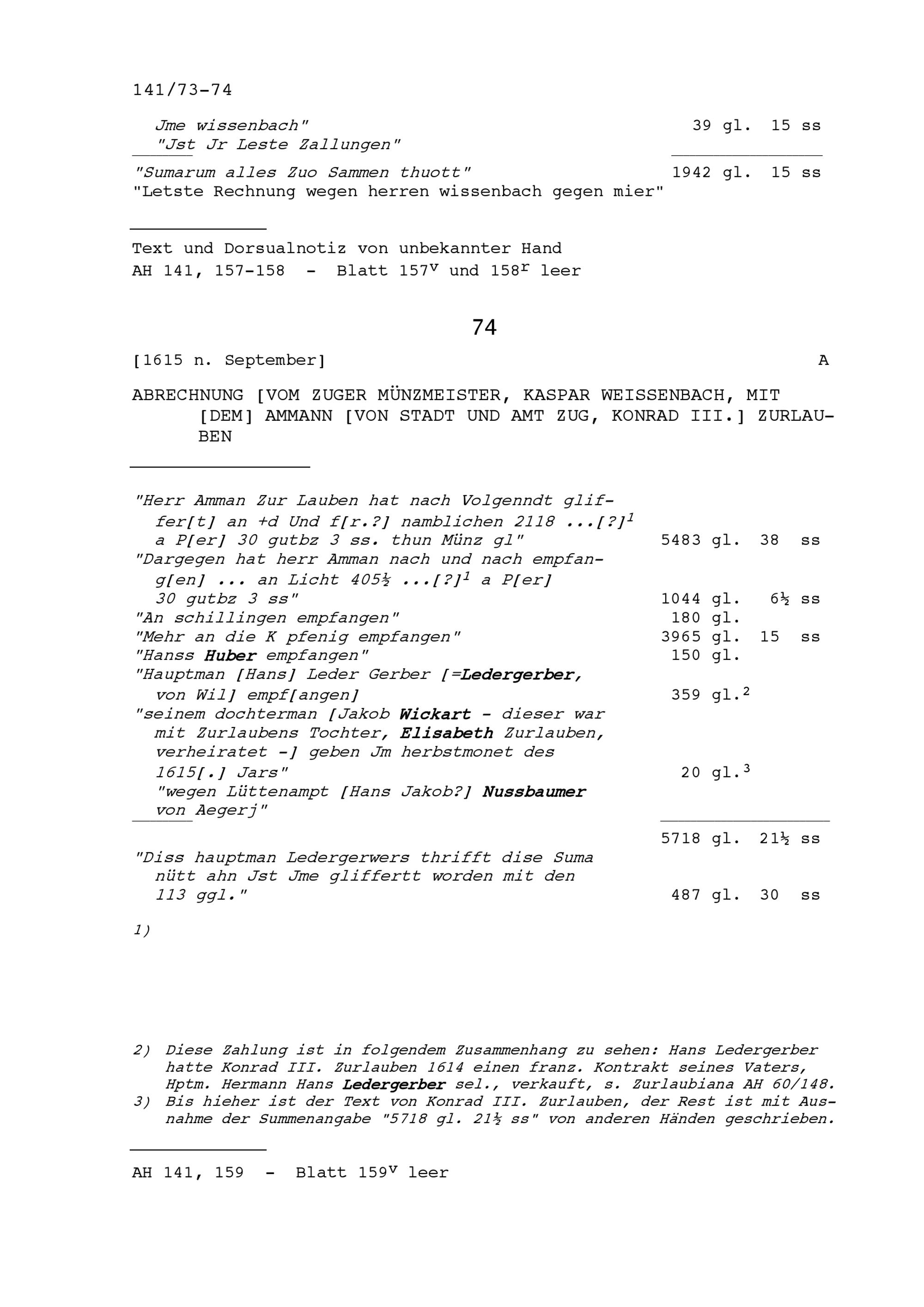 Abrechnung von Kaspar Weissenbach, Zuger Münzmeister, mit Konrad III. Zurlauben, Ammann von Stadt und Amt Zug