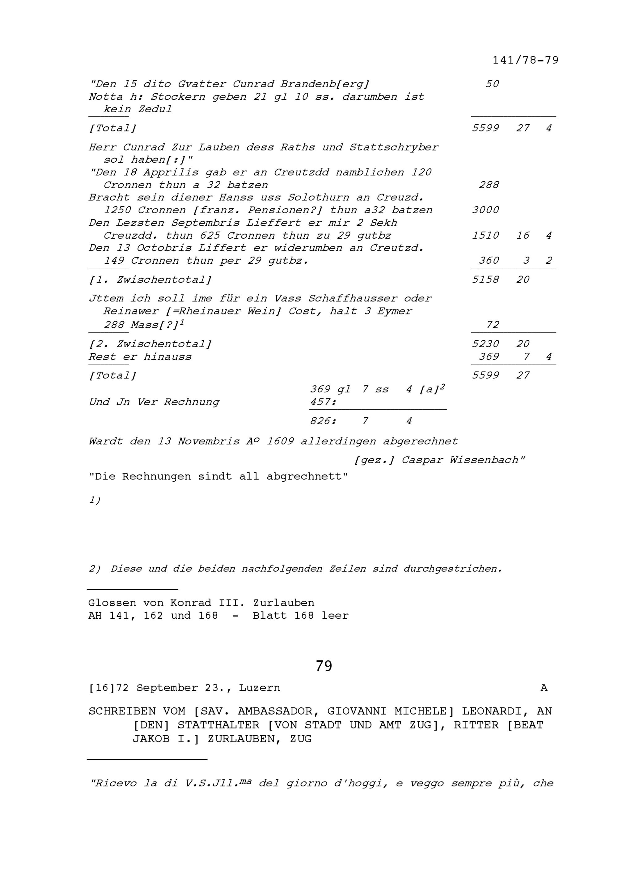 Schreiben von Giovanni Michele Leonardi, Ambassador von Savoyen, an Beat Jakob I. Zurlauben, Statthalter von Stadt und Amt Zug, Zug