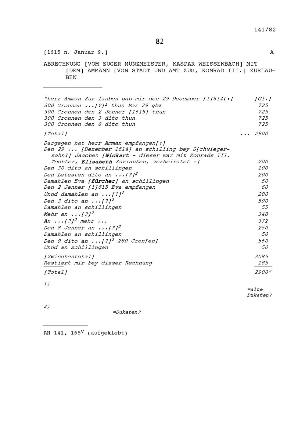 Abrechnung von Kaspar Weissenbach, Zuger Münzmeister, mit Konrad III. Zurlauben, Ammann von Stadt und Amt Zug