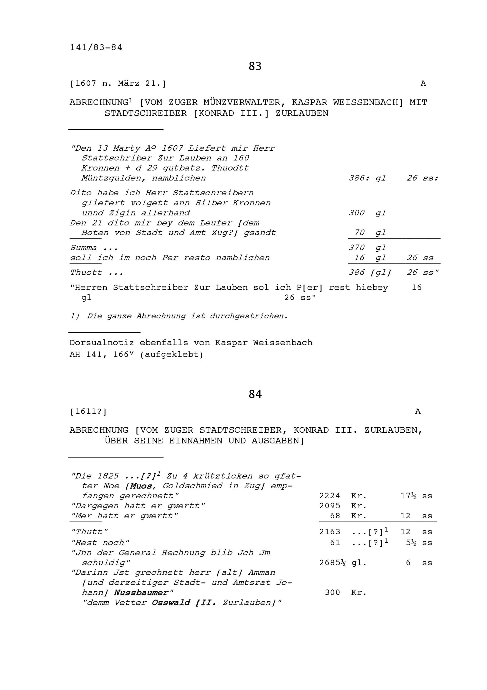 Abrechnung von Kaspar Weissenbach, Zuger Münzverwalter, mit Konrad III. Zurlauben, Stadtschreiber