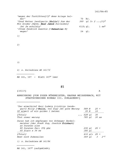 Abrechnung von Kaspar Weissenbach, Zuger Münzmeister, mit Konrad III. Zurlauben, Stadtschreiber