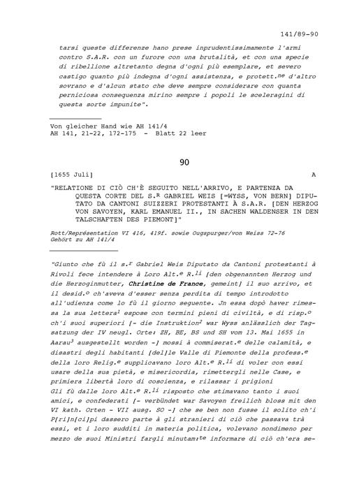 Bericht aus dem Geheimarchiv auf die Frage von Gabriel Wyss, Gesandter der Neugläubigen Orte, von Bern an Karl Emanuel II., Herzog von Savoyen in Sachen Waldenser in den Talschaften des Piemont