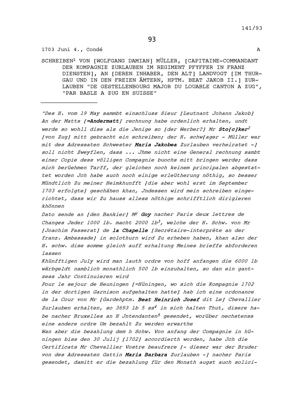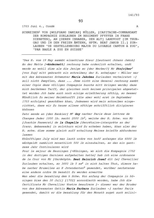 Schreiben von Wolfgang Damian Müller, Kommandant der Kompanie Zurlauben im Regiment...