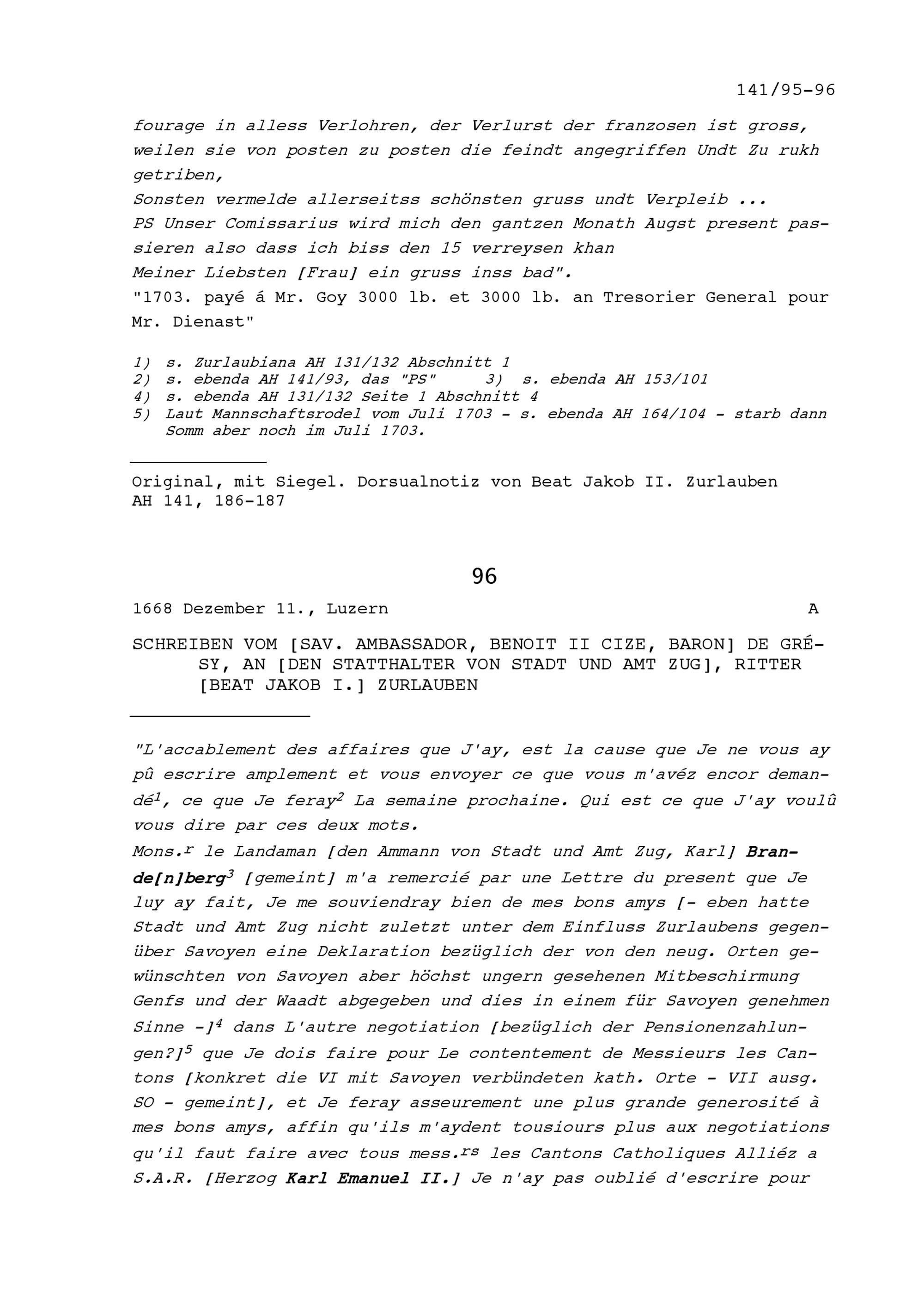 Schreiben von Benoît II. Cize, Baron de Grésy, Ambassador von Savoyen, an Beat Jakob I. Zurlauben, Statthalter von Stadt und Amt Zug