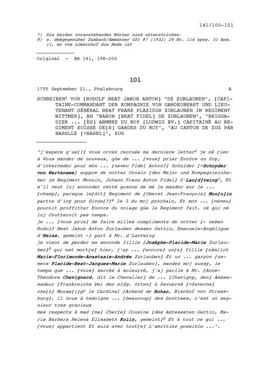 Schreiben von Rudolf Beat Jakob Anton Zurlauben, Kommandant der Kompanie von Beat...