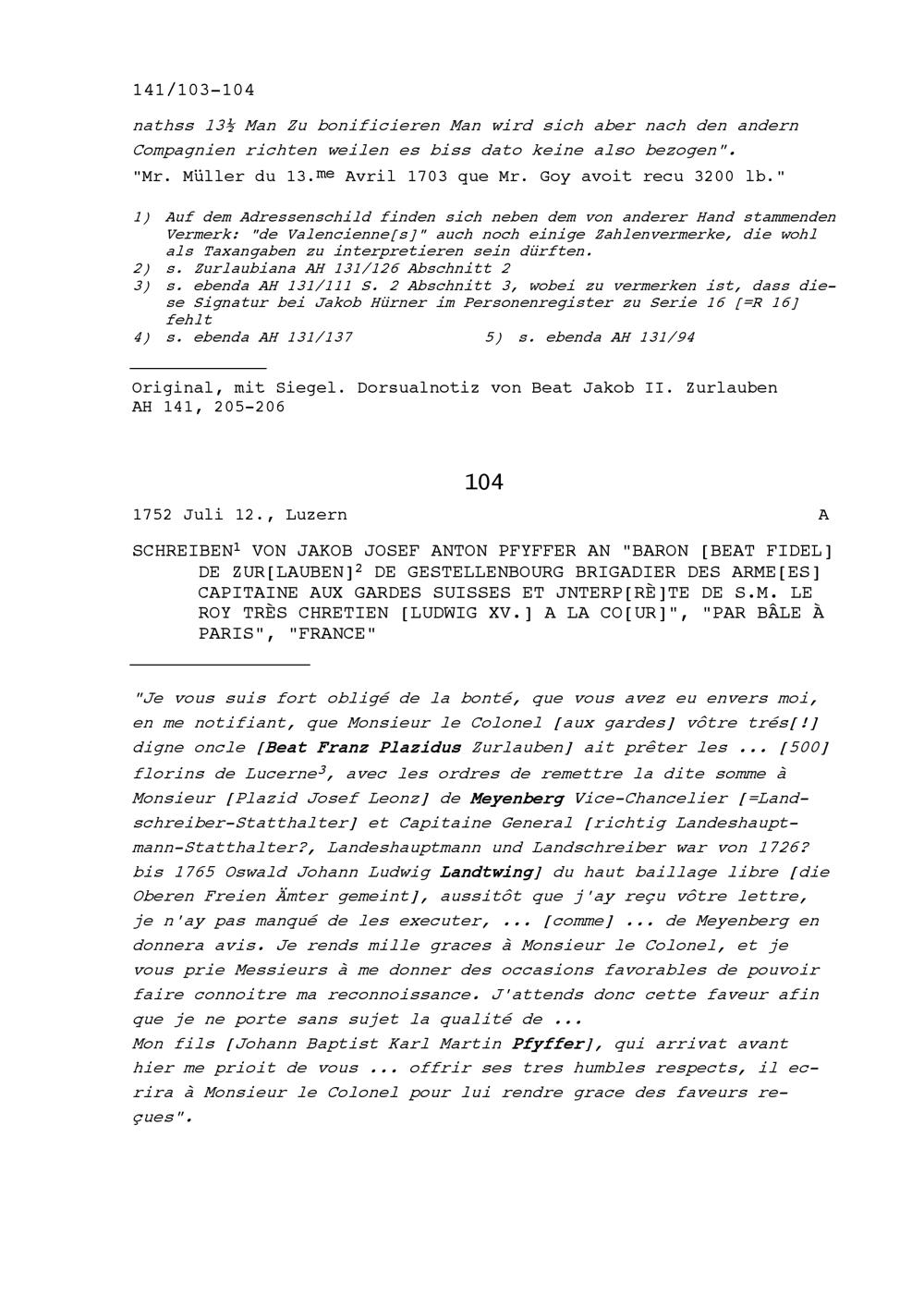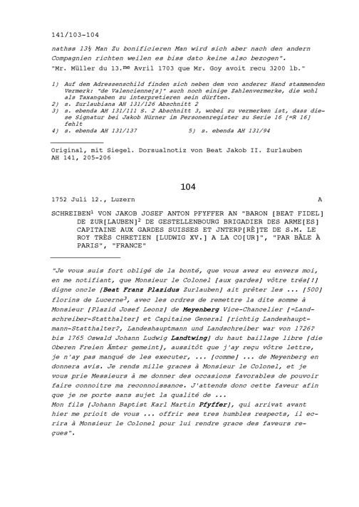 Schreiben von Jakob Josef Anton Pfyffer an Beat Fidel Zurlauben, Brigadier, Paris