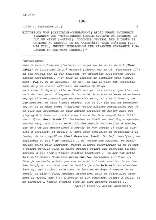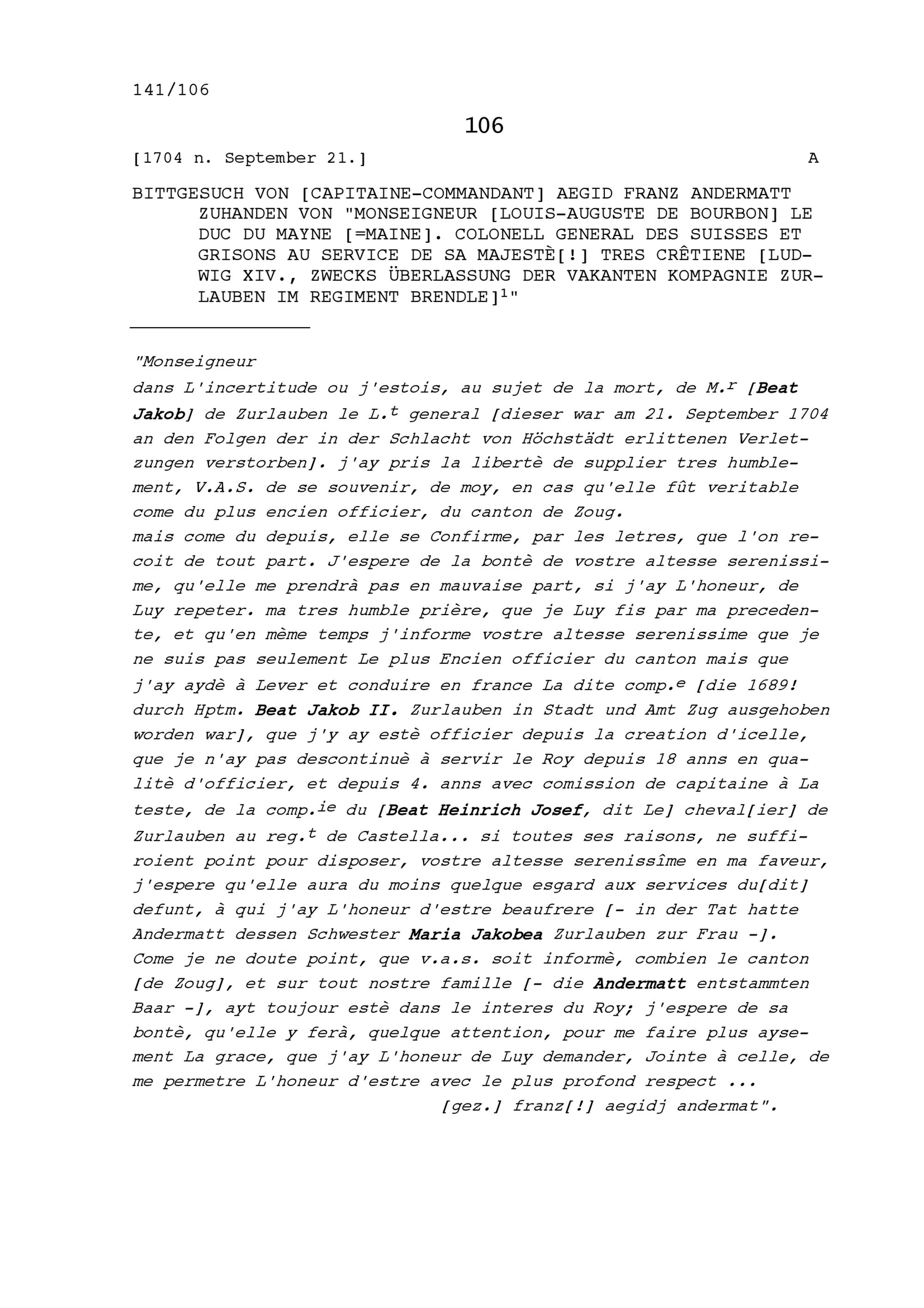 Bittgesuch von Ägid Franz Andermatt zuhanden von Louis-Auguste de Bourbon, Duc du Maine, Kommandant des Regiments der Schweizer und Bündner Garden, zwecks Überlassung der vakanten Kompanie Zurlauben im Regiment Jost Brendlé