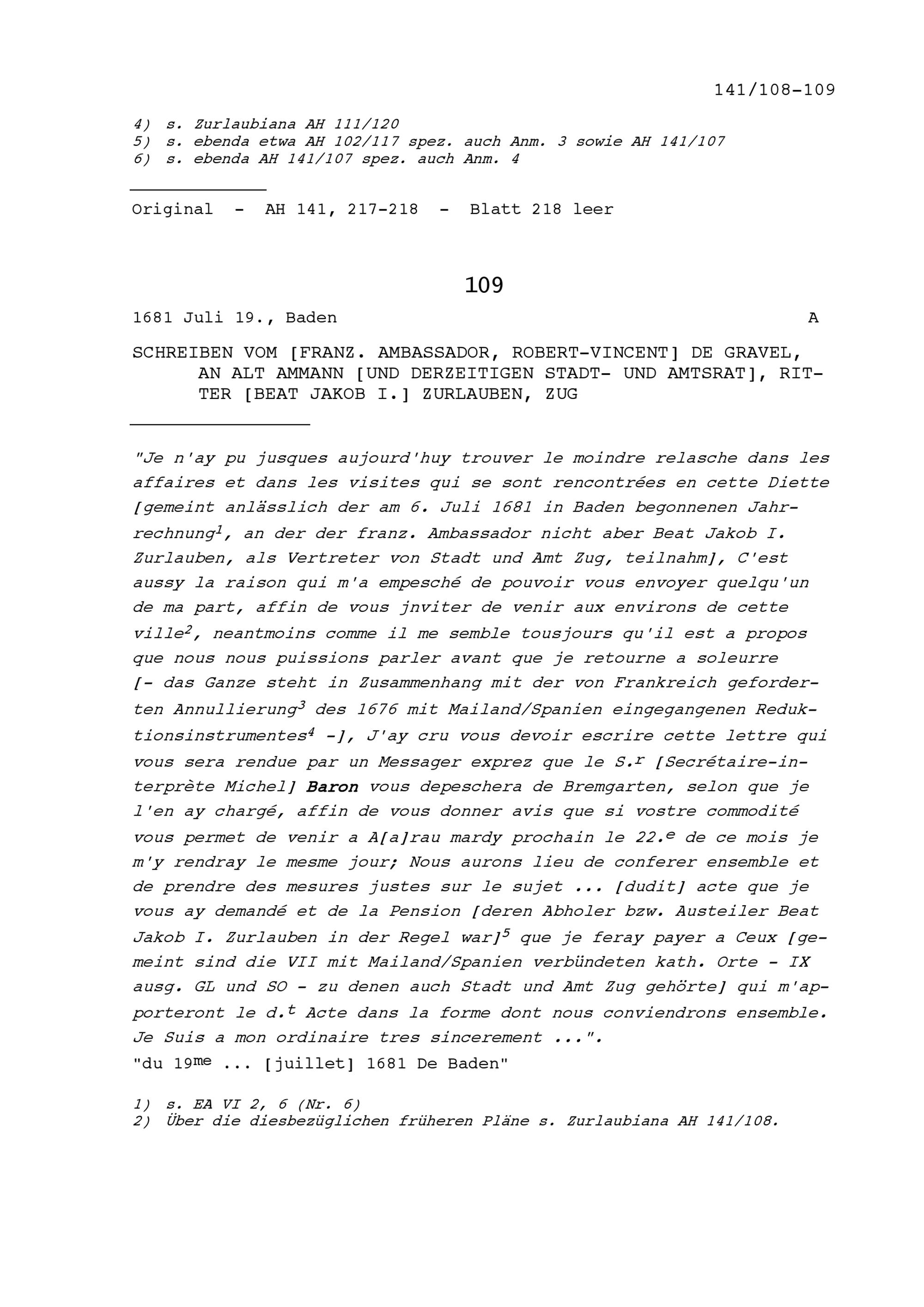 Schreiben von Robert-Vincent de Gravel, Ambassador von Frankreich, an Beat Jakob I. Zurlauben, Altammann und Stadt- und Amtrat, Zug