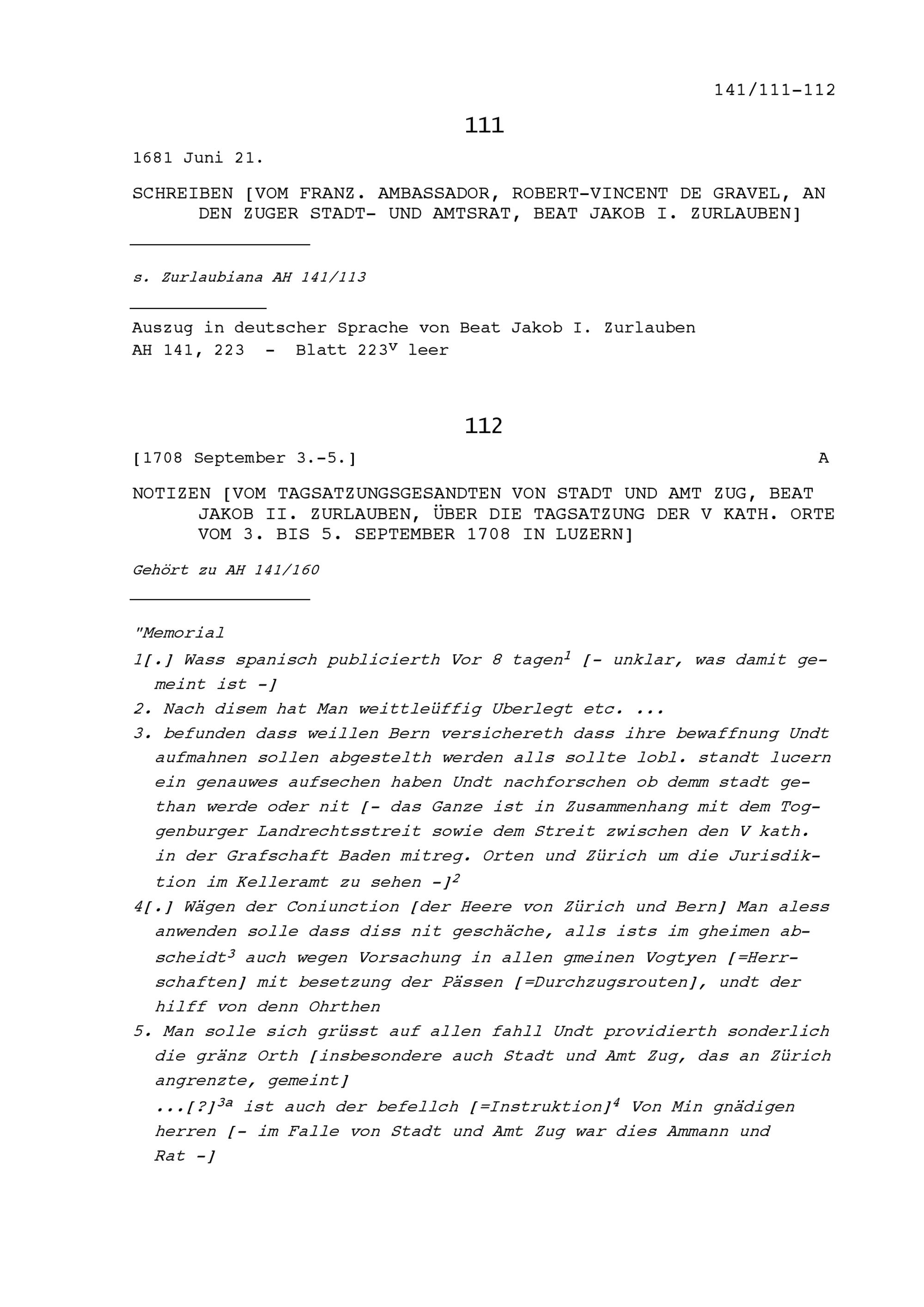 Schreiben von Robert-Vincent de Gravel, Ambassador von Frankreich, an Beat Jakob I. Zurlauben, Stadt- und Amtrat Zug