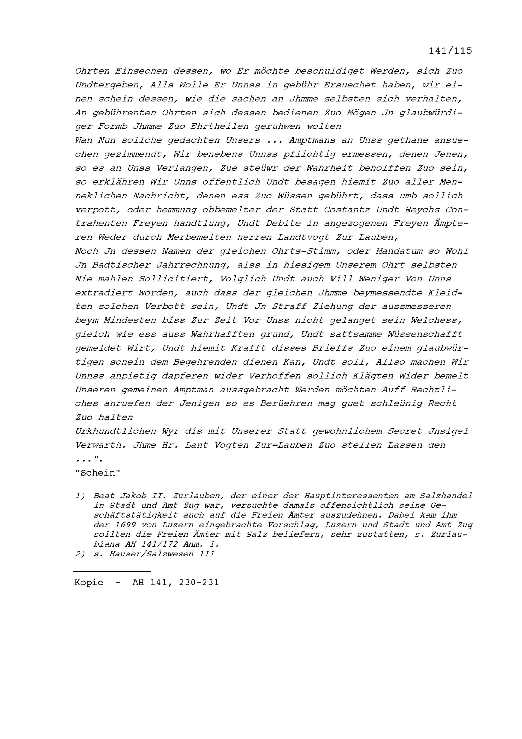 Ratsbeschluss des Schultheiss und Rats Luzern für Beat Jakob II. Zurlauben, Landvogt der Freien Ämter, bezüglich des Salzhandels
