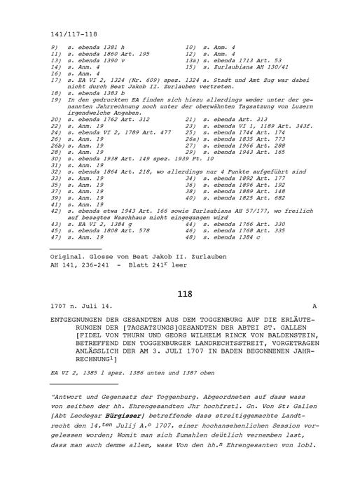 Entgegnungen der Gesandten aus dem Toggenburg auf die Erläuterungen von Fidel von Thurn, Tagsatzungsgesandter der Abtei Sankt Gallen, und Georg Wilhelm Rinck von Baldenstein, Tagsatzungsgesandter der Abtei Sankt Gallen, betreffend den Toggenburger Landrechtsstreit, vorgetragen in Baden an der am 3. Juli 1707 begonnenen Jahrrechnung