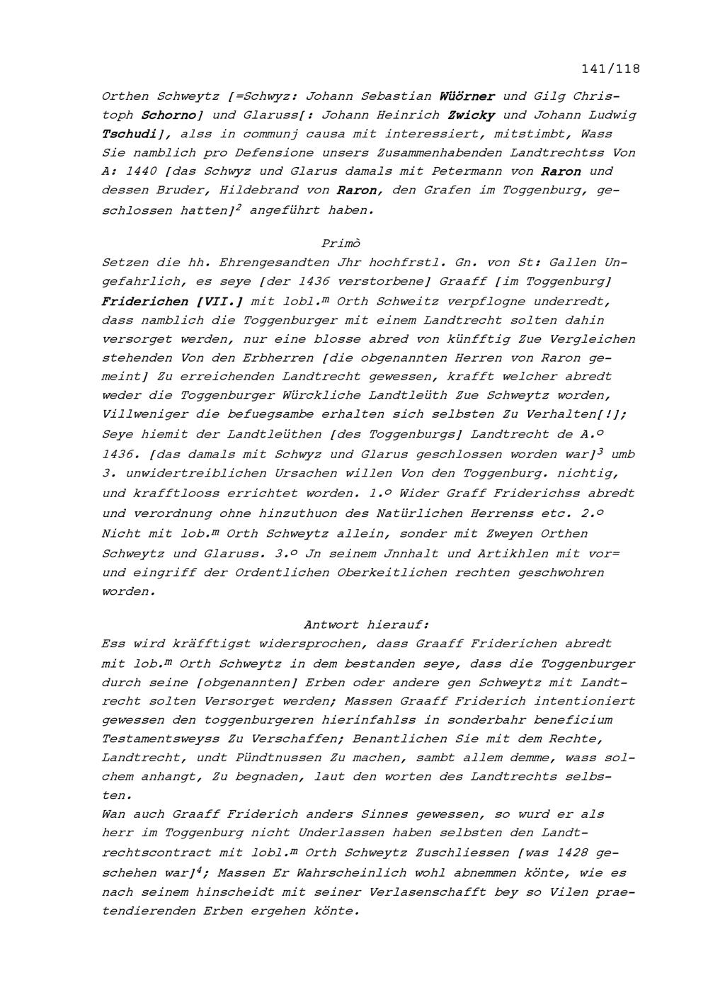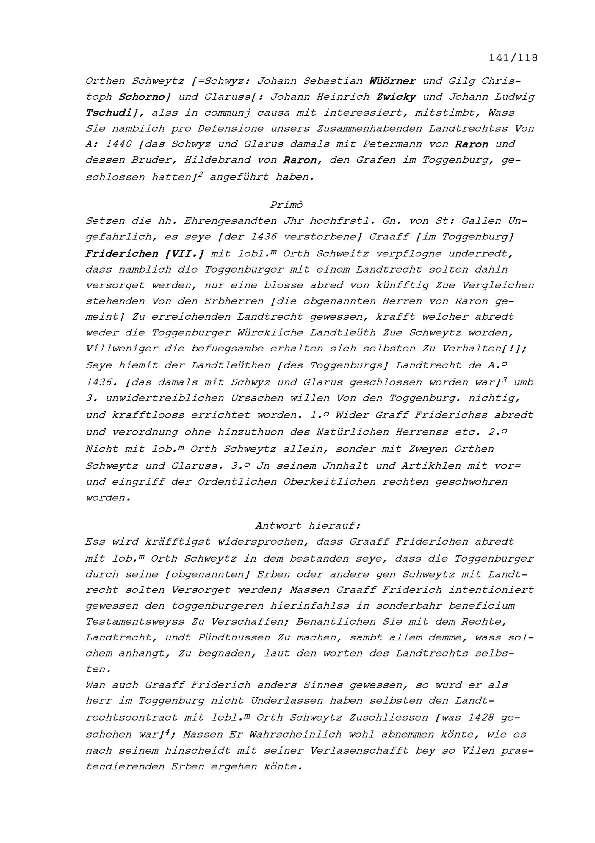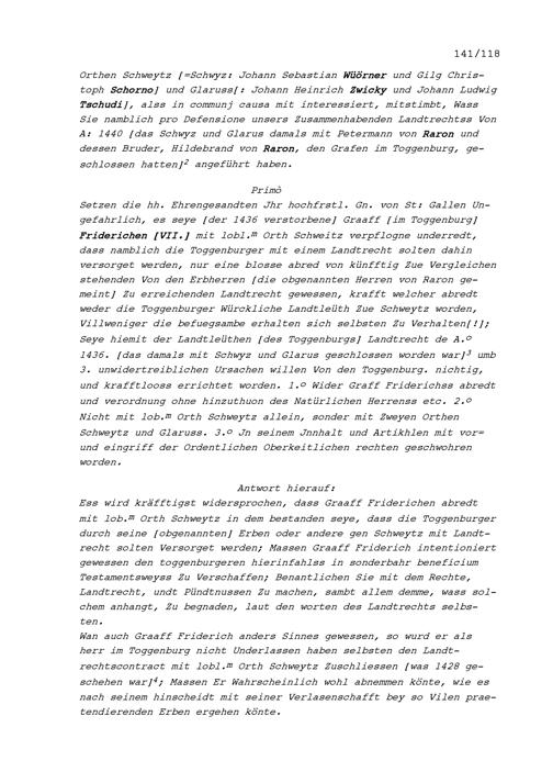 Entgegnungen der Gesandten aus dem Toggenburg auf die Erläuterungen von Fidel von Thurn, Tagsatzungsgesandter der Abtei Sankt Gallen, und Georg Wilhelm Rinck von Baldenstein, Tagsatzungsgesandter der Abtei Sankt Gallen, betreffend den Toggenburger Landrechtsstreit, vorgetragen in Baden an der am 3. Juli 1707 begonnenen Jahrrechnung