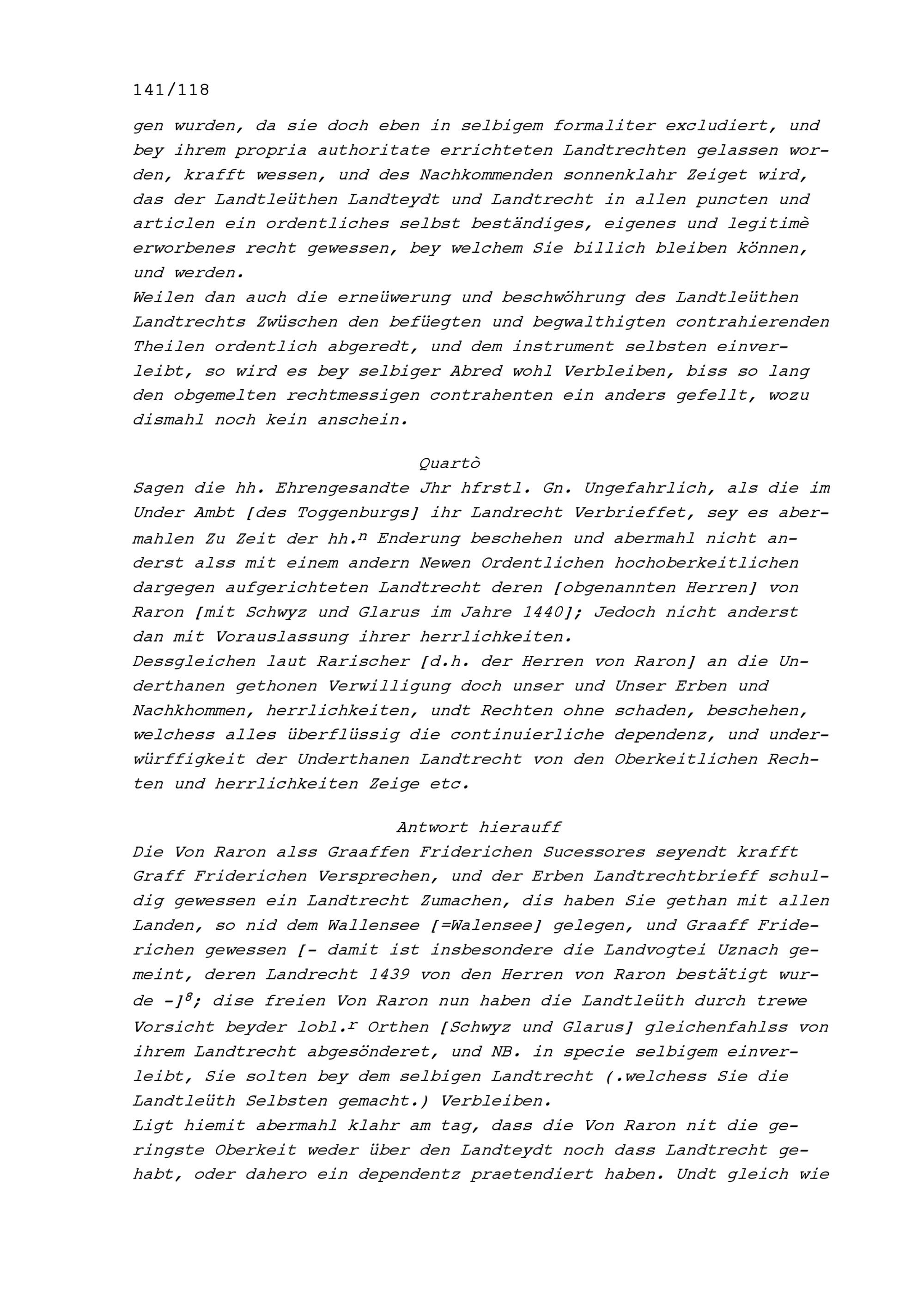 Entgegnungen der Gesandten aus dem Toggenburg auf die Erläuterungen von Fidel von Thurn, Tagsatzungsgesandter der Abtei Sankt Gallen, und Georg Wilhelm Rinck von Baldenstein, Tagsatzungsgesandter der Abtei Sankt Gallen, betreffend den Toggenburger Landrechtsstreit, vorgetragen in Baden an der am 3. Juli 1707 begonnenen Jahrrechnung
