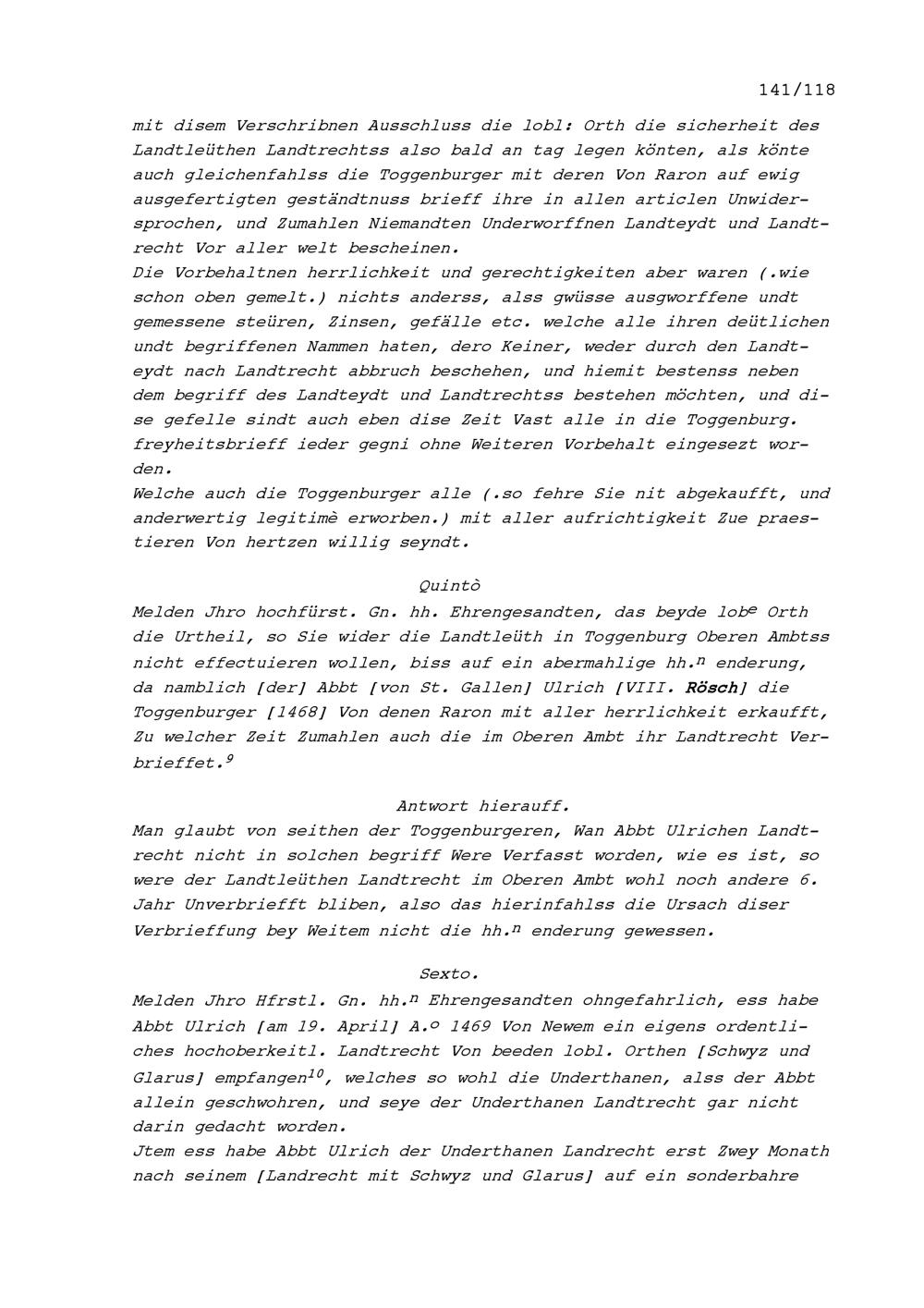 Entgegnungen der Gesandten aus dem Toggenburg auf die Erläuterungen von Fidel von Thurn, Tagsatzungsgesandter der Abtei Sankt Gallen, und Georg Wilhelm Rinck von Baldenstein, Tagsatzungsgesandter der Abtei Sankt Gallen, betreffend den Toggenburger Landrechtsstreit, vorgetragen in Baden an der am 3. Juli 1707 begonnenen Jahrrechnung