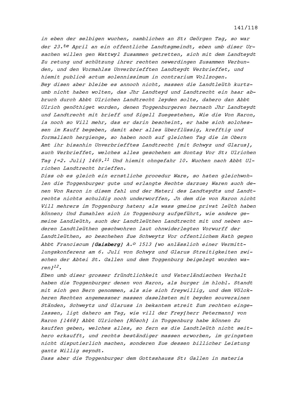 Entgegnungen der Gesandten aus dem Toggenburg auf die Erläuterungen von Fidel von Thurn, Tagsatzungsgesandter der Abtei Sankt Gallen, und Georg Wilhelm Rinck von Baldenstein, Tagsatzungsgesandter der Abtei Sankt Gallen, betreffend den Toggenburger Landrechtsstreit, vorgetragen in Baden an der am 3. Juli 1707 begonnenen Jahrrechnung