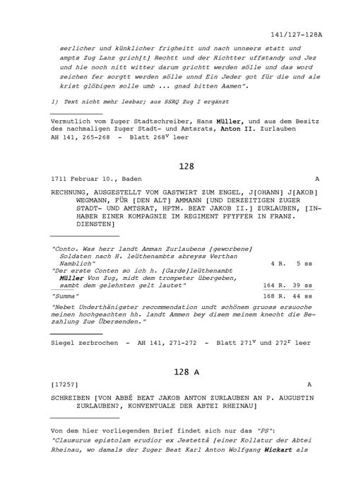 Rechnung für Beat Jakob II. Zurlauben, Altammann und Stadt- und Amtrat Zug, Hauptmann, Inhaber einer Kompanie im Regiment Pfyffer in französischen Diensten, ausgestellt Johann Jakob Wegmann, von Gastwirt zum Engel,