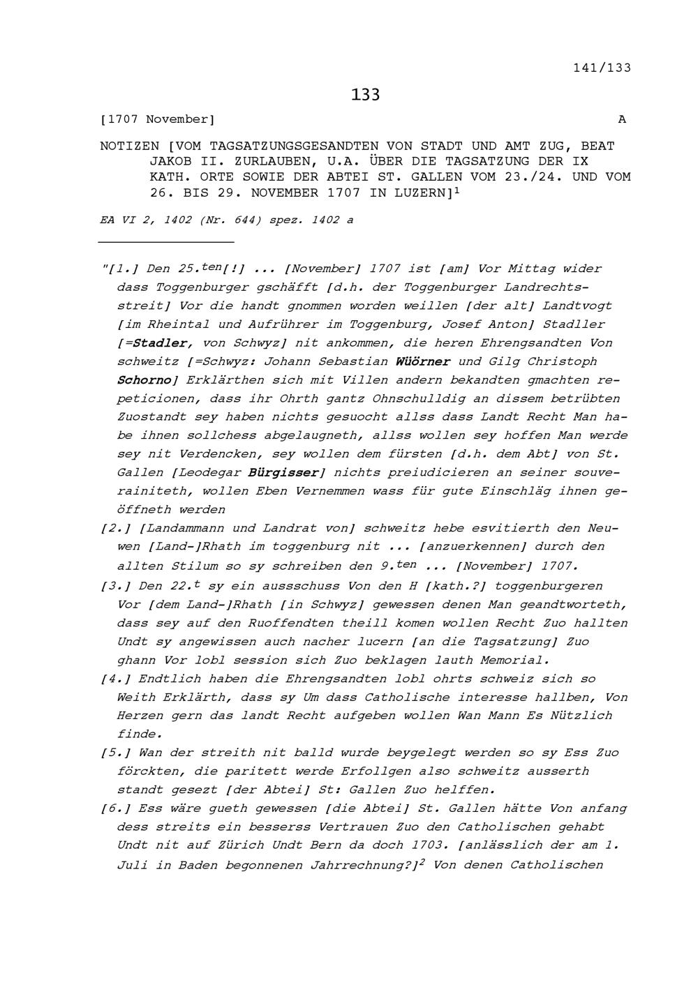 Notiz von Beat Jakob II. Zurlauben, Tagsatzungsgesandter von Stadt und Amt Zug, unter anderem an der Tagsatzung der Neun Katholischen Orte sowie der Abtei Sankt Gallen vom 23. und 24. und vom 26. bis 29. November 1707 in Luzern